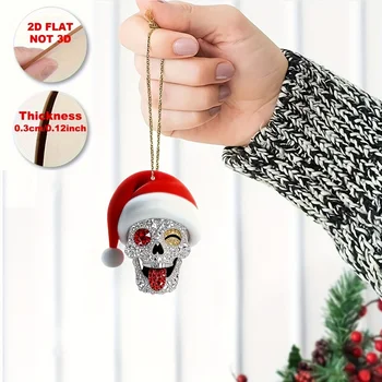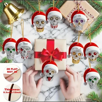 Crafted from lightweight, durable 2D flat acrylic, each ornament features a high-definition print designed to mimic the sparkling look of encrusted diamonds and precious gems. The set includes an assortment of skull designs wearing classic red Santa hats, detailed with faux-jewel accents in vibrant ruby red, emerald green, deep purple, and shimmering gold tones.